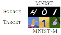 An example use case of Domain Adaptation involves the MNIST dataset, which consists of images of handwritten digits. This dataset is ubiquitous in the literature and is frequently used as a benchmark when testing models. There is also a data set called MNIST-M which adds different backgrounds and digit colors, as shown in Figure 2.