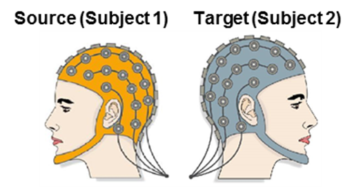 Another useful DA example is addressing how biological signals, in particular neural signals, change over time or subject. Let’s say we want to develop a brain-computer interface application and need to classify human subjects’ thoughts about moving a specific arm or leg to control an external prosthetic device. Using EEG signals from a Source Subject (Figure 3), we would typically develop a classifier. However, applying that classifier to our Target Subject might result in poor performance. Domain adaptation would allow us to achieve higher performance on our Target Subject without having to collect data from every subject.