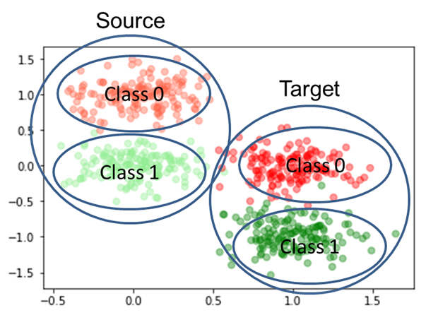Observe how the data has been shifted between the source and target domains. Within each domain, the classes can be linearly separated but the shift significantly complicates generalization of that model.