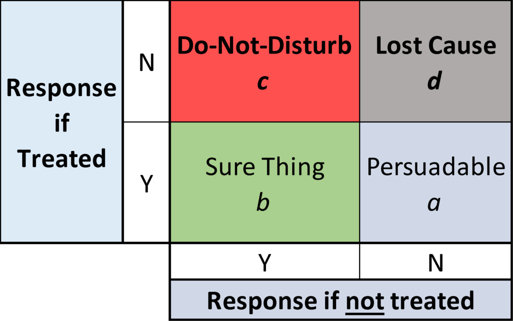 Uplift modeling is also known as incremental modeling, treatment effects modeling, true lift modeling, or net modeling. Uplift is the increase in likelihood of the outcome with the treatment as compared to the outcome without the treatment. We can’t observe this difference, or causal effect, directly, but must infer it from an experiment. It is very helpful to visualize a 2×2 matrix, as shown below, with four categories of people (say) to be classified, as: (a) Persuadable, (b) Sure Thing, (c) Do-Not-Disturb, and (d) Lost Cause as shown in the figure below.