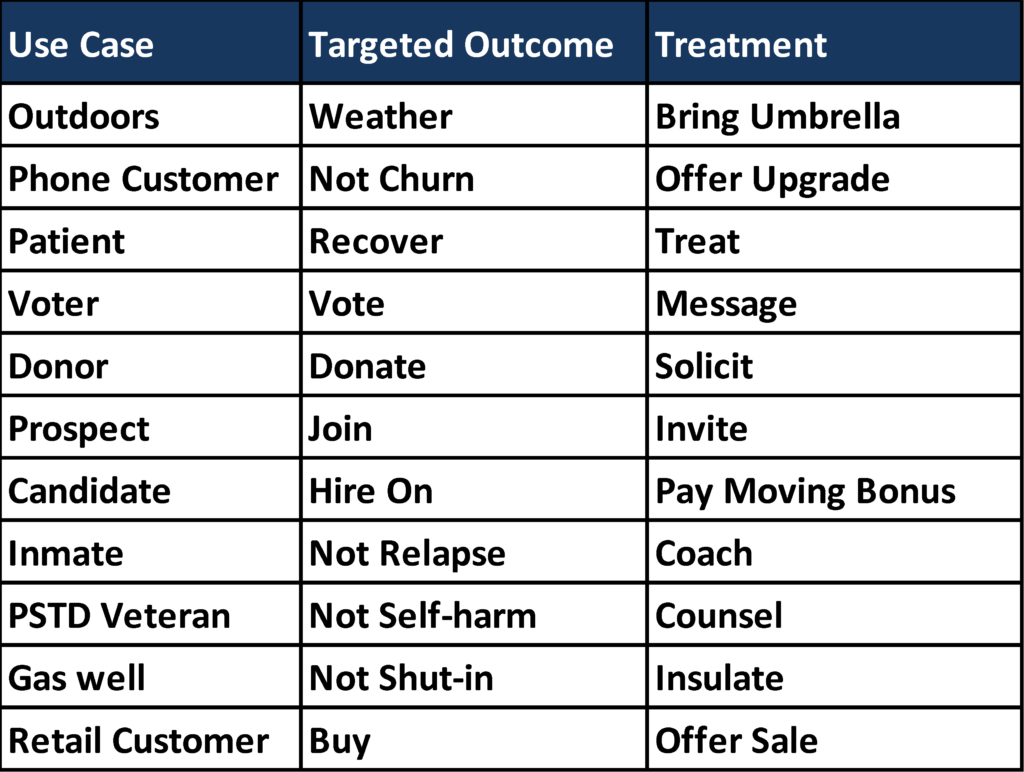 There are many applications of predictive modeling where the outcome is predicted as advice only to a human decision maker, and no action is directly taken automatically from the model result. An example is workload prioritization for customer service or fraud investigative teams. But where we can, we aim to influence the outcome one way or another. Will a live agent offering the phone customer a contract upgrade decrease their likelihood to churn? Will soliciting a fund raising prospect with a flyer in the mail improve their chances of making a donation? Will offering a moving bonus increase the likelihood that a desirable candidate will accept our employment offer?